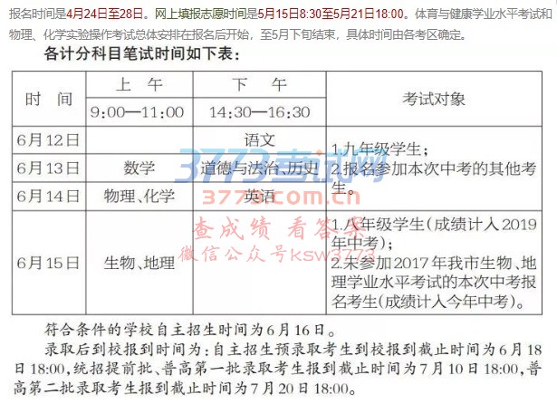 报名时间是4月24日至28日。网上填报志愿时间是5月15日8:30至5月21日18:00。体育与健康学业水平考试和物理、化学实验操作考试总体安排在报名后开始,至5月下旬结束,具体时间由各考区确定。