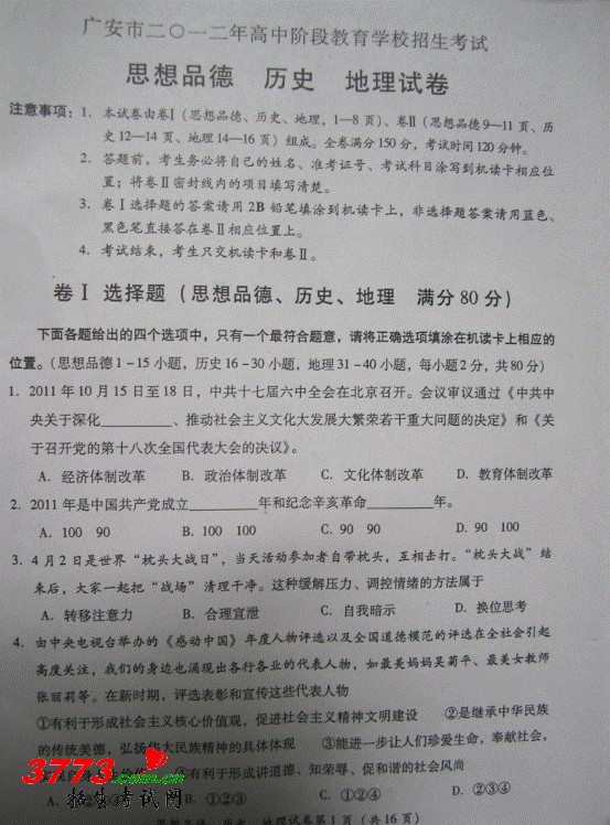 2012广安中考政治历史地理试卷答案