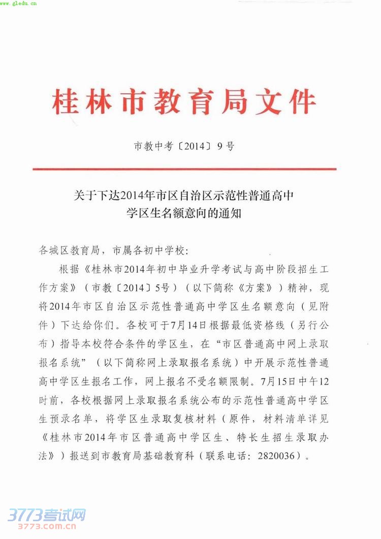 2014年桂林市区自治区示范性普通高中学区生名额意向