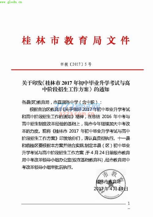 关于印发桂林市2017年初中毕业升学考试与高中阶段招生工作方案的通知