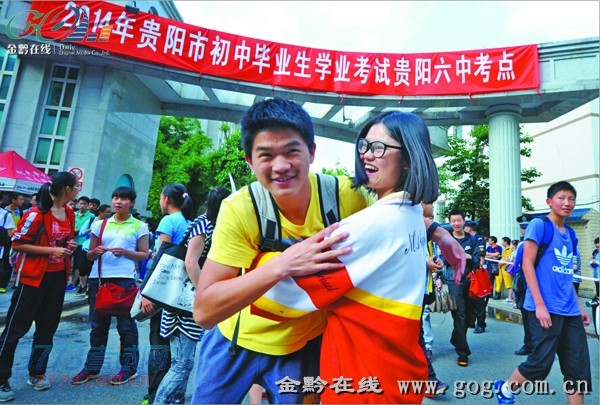 一个欢乐的拥抱足以证明考得很顺利!记者雷志坤摄