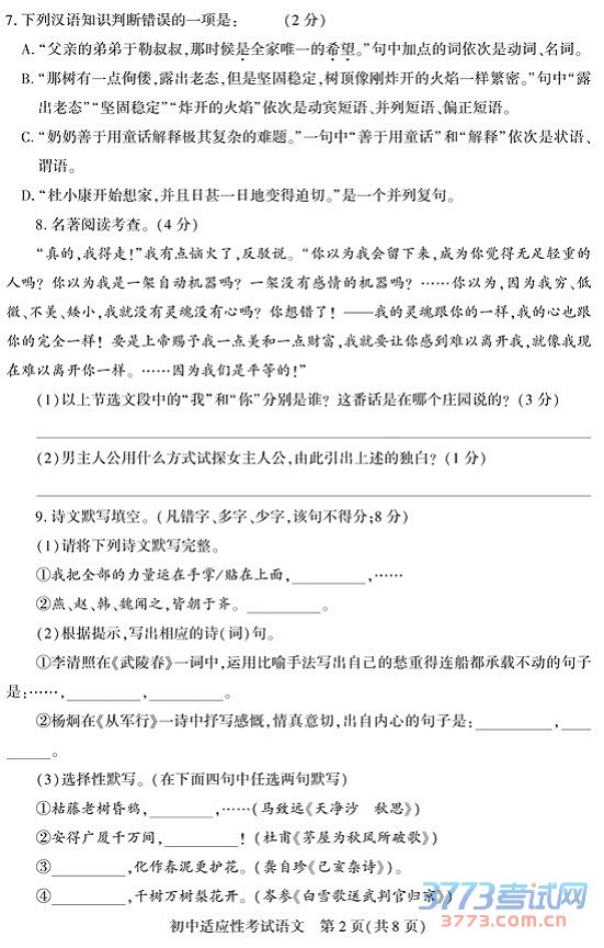 2015贵阳中考语文试题及答案评分标准
