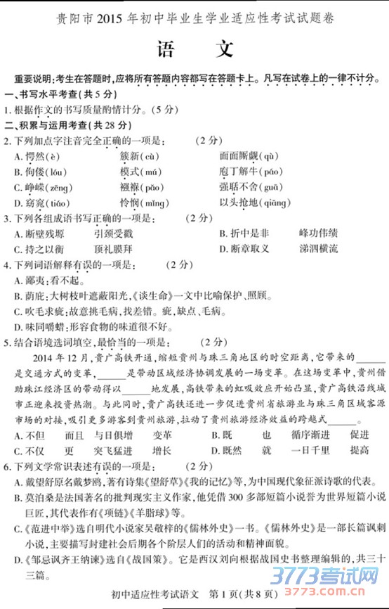 2015贵阳中考语文