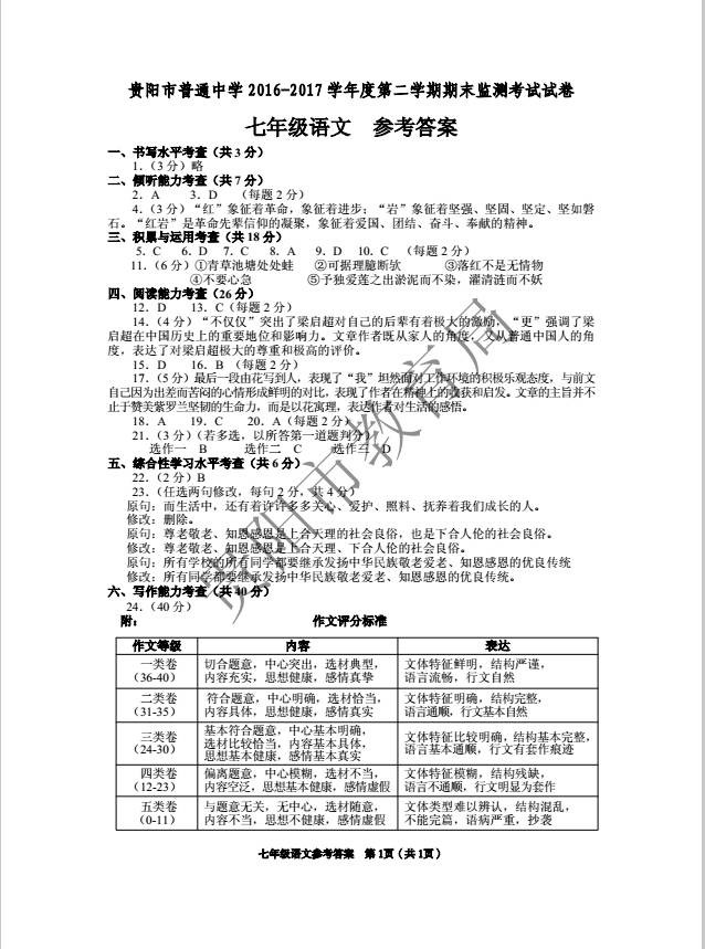 2017第二学期期末考试贵阳七年级语文答案发布