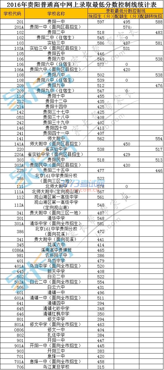 2016贵阳二中分数线 贵阳二中录取分数