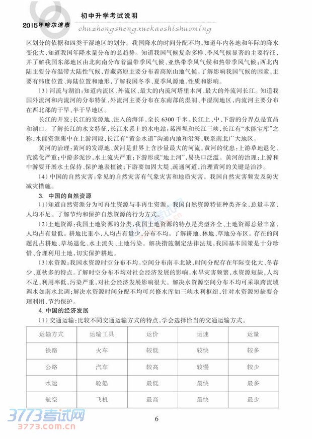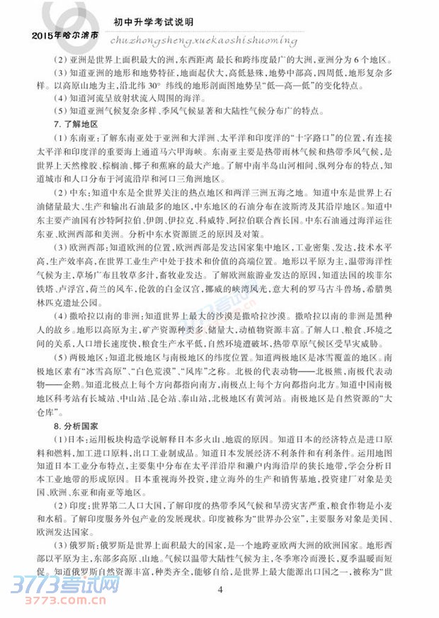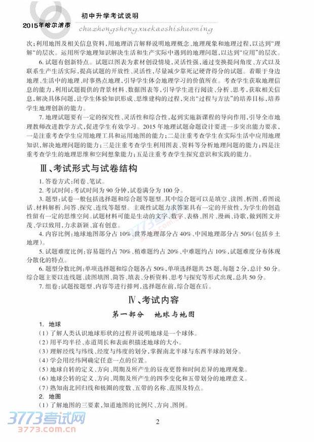 哈尔滨市2015年初中升学考试说明(地理)