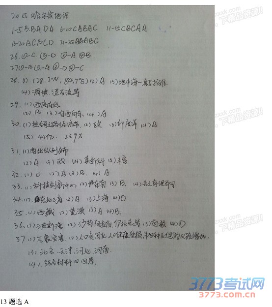 2015哈尔滨中考会考地理试题及答案公布