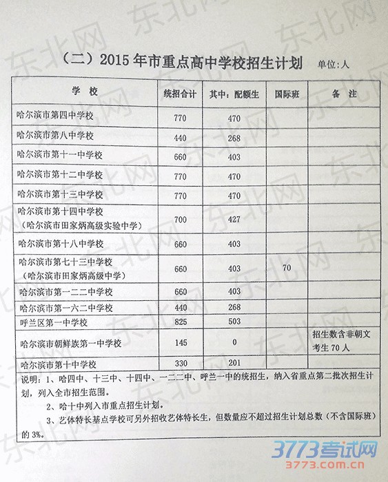 其中,哈四中、十三中、十四中二二中、呼兰一中的统招生,纳入省重点第二批次招生计划,列入全市招生范围;哈十中列入市重点招生计划;哈市七十三中学校增加国际班招生计划70人;艺体特长基点学校可另外招收艺体特长生但数量应不超过招生计划总数(不含国际班)的3%