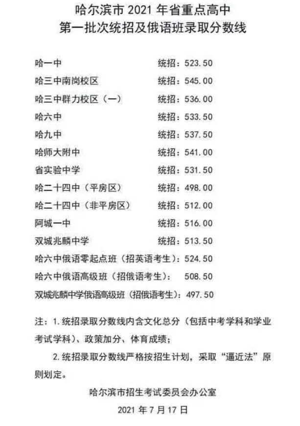2021年黑龙江哈尔滨省重点高中第一批次统招分数线公布,希望对同学们有所帮助,仅供参考。