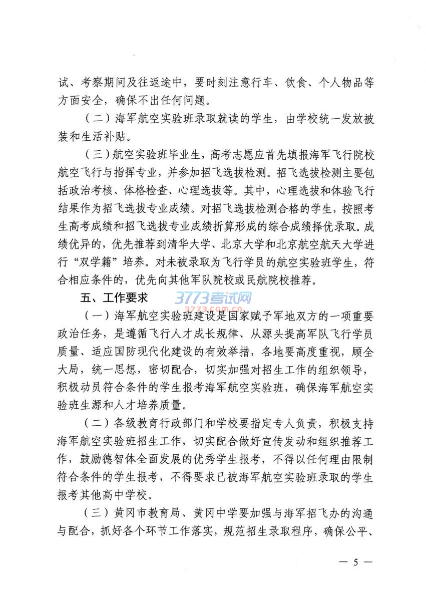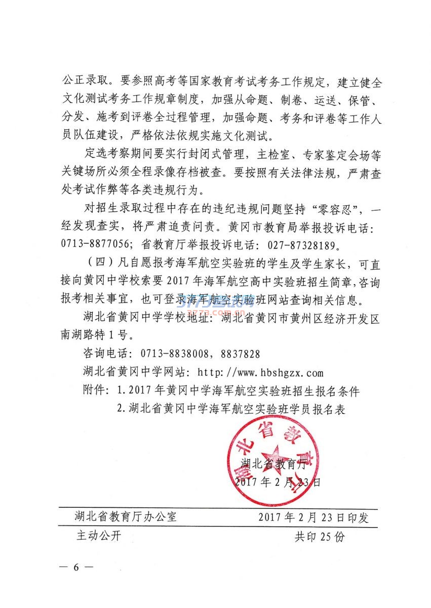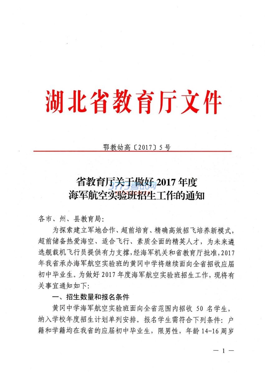 湖北省教育厅关于做好2017年度海军航空实验班招生工作的通知