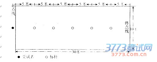 6.足球运球:受试者站在起点线后准备,听到出发口令后开始向前运球依次过杆,不得碰杆。受试者和球均越过终点线即为结束。发令员发令后开始计时,受试者与球均返回终点线时停表。每名受试者测两次,记录其中成绩最好一次。如两次均犯规,补测一次作为最终成绩。以秒为单位记录测试成绩,精确到小数点后1位,小数点后第2位数按非零进1原则进位。