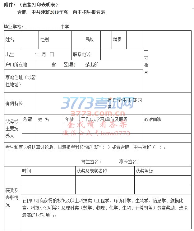 合肥一中共建班2018年高一自主招生简章