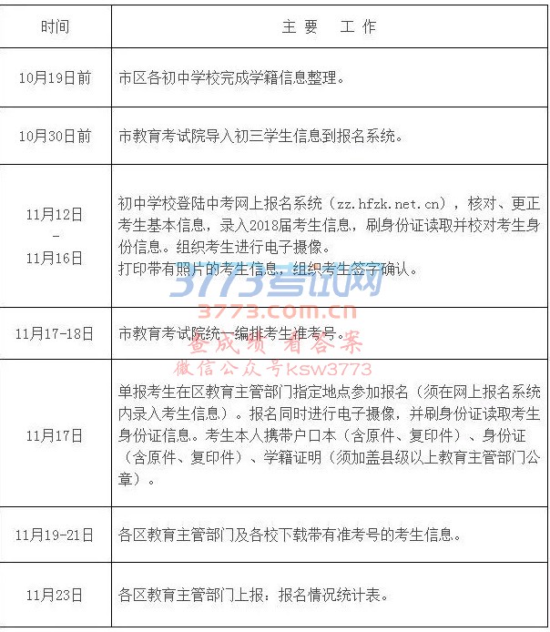 2018年11月12-16日,各校登陆合肥招生考试网(zz.hfzk.net.cn),进入中考网上报名系统,核对应届毕业生信息;同时录入历届生报名信息。