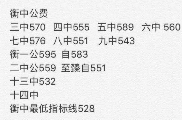2018年中考衡中公助生分数线衡中公费指标生: 三中570, 四中555, 五中589, 六中560, 七中576, 八中551, 九中543。 衡水一中公费595, 衡水一中自费583, 二中公费559, 志臻公费558, 至臻自费551, 13中公费532。