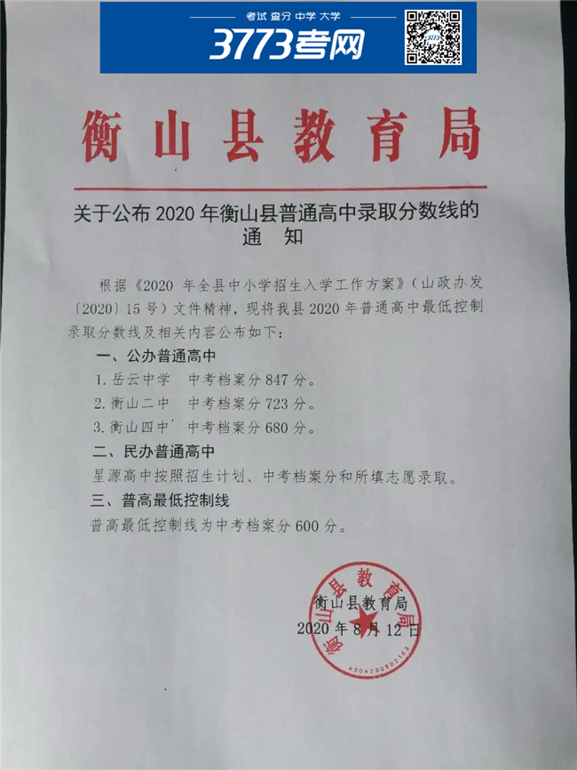 关于公布2020年衡山县普通高中录取分数线的通知