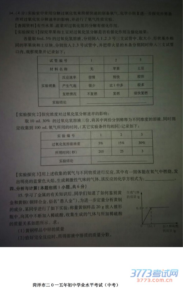 2015菏泽中考物理化学试题及答案