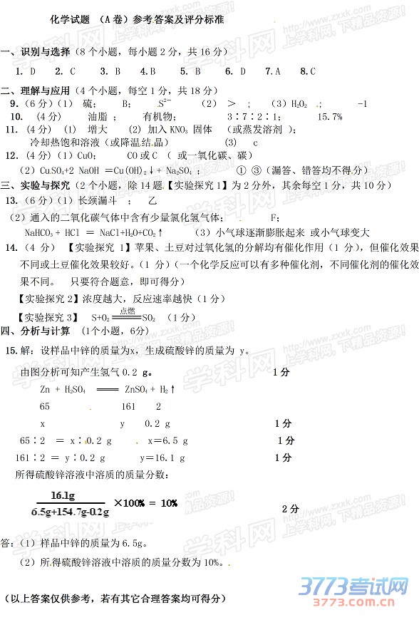 2015菏泽中考化学试题及答案评分标准