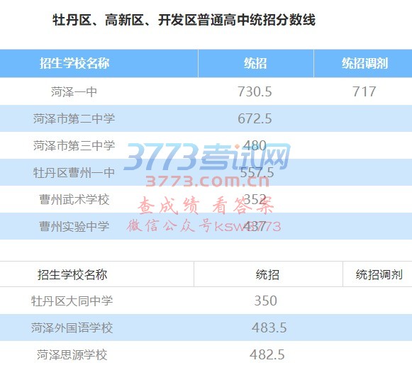 据了解,菏泽一中今年统招生录取分数线比去年的707分高了23.5分,指标生调剂线比去年的670.5分高了46.5分;菏泽二中今年统招生录取分数线比去年的613.5分高了59分;菏泽三中今年统招生录取分数线和去年相同,仍为480分;曹州一中今年统招生录取分数线比去年的516.5分高了41分。