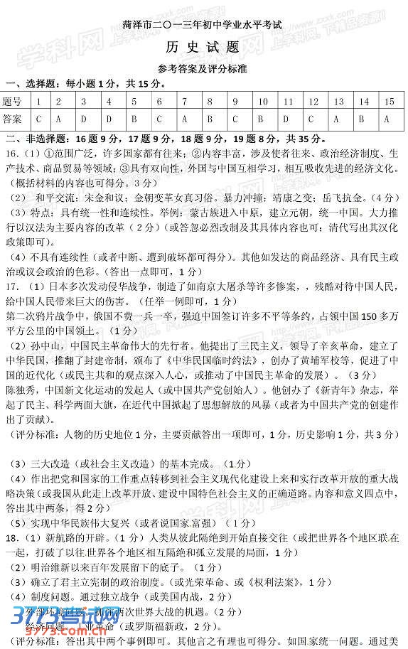 2013菏泽中考历史答案