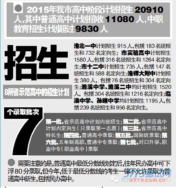2015年我市高中阶段计划招生20910人,其中普通高中计划招收11080人,中职教育招生计划超过9830人,初中毕业生升入高中阶段比例和高中阶段毛入学率达95.49%以上。