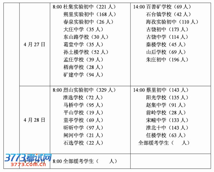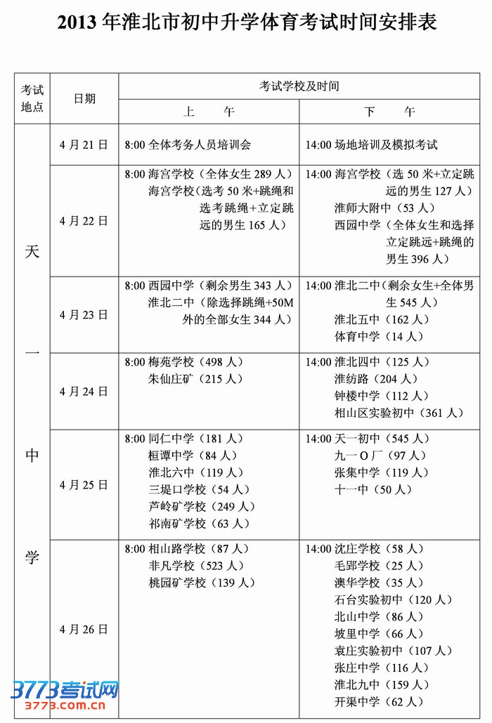 2013年淮北市中考体育考试日程安排