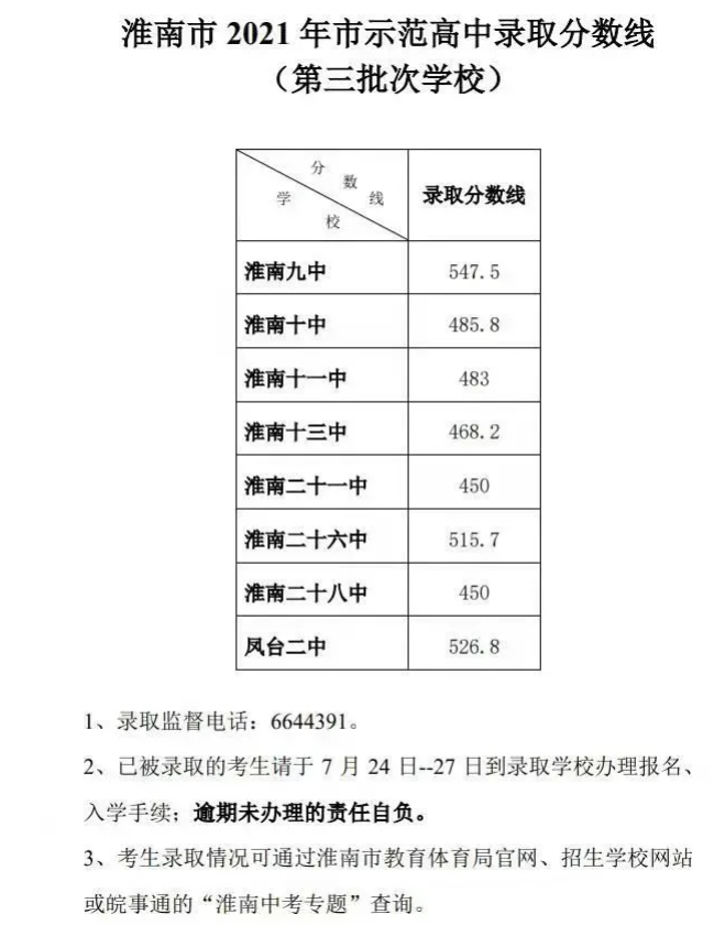淮南市2021年市示范高中录取分数线(第三批次)划定