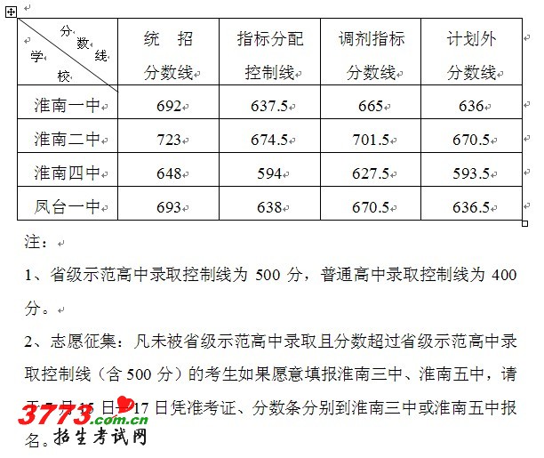 统招分数线 指标生控制线 调剂指标分数线 计划外分数线淮南一中 692 637.5 665 636淮南二中723 674.5 701.5 670.5淮南四中648 594 627.5 593.5凤台一中693 636 670.5 636.5