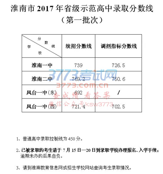 淮南市2017省级示范高中录取分数线及录取名单(第一批次)公布
