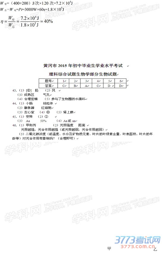 2015黄冈中考理综物理化学生物试题及答案