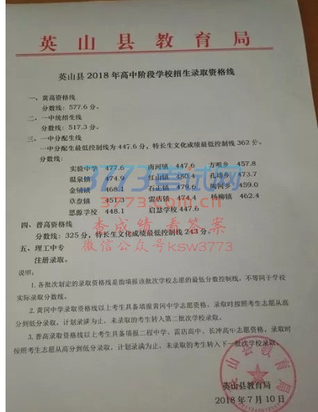 2018年英山高中招生录取分数线公布!