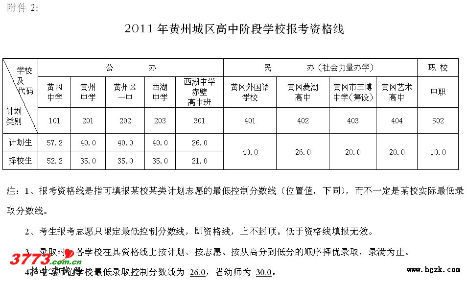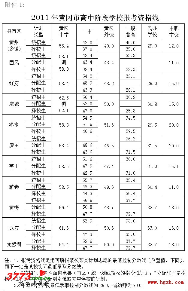 1、黄冈市2011年高中阶段学校报考资格线(见表一)
