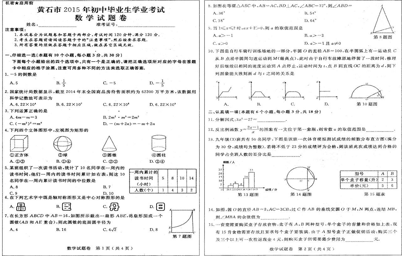 公布中考试题、答案和中考作文。祝各位考生都能取得好的成绩。2015年湖北黄石中考数学试题及答案(图片版):
