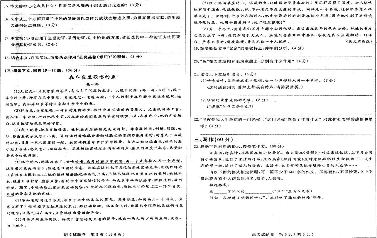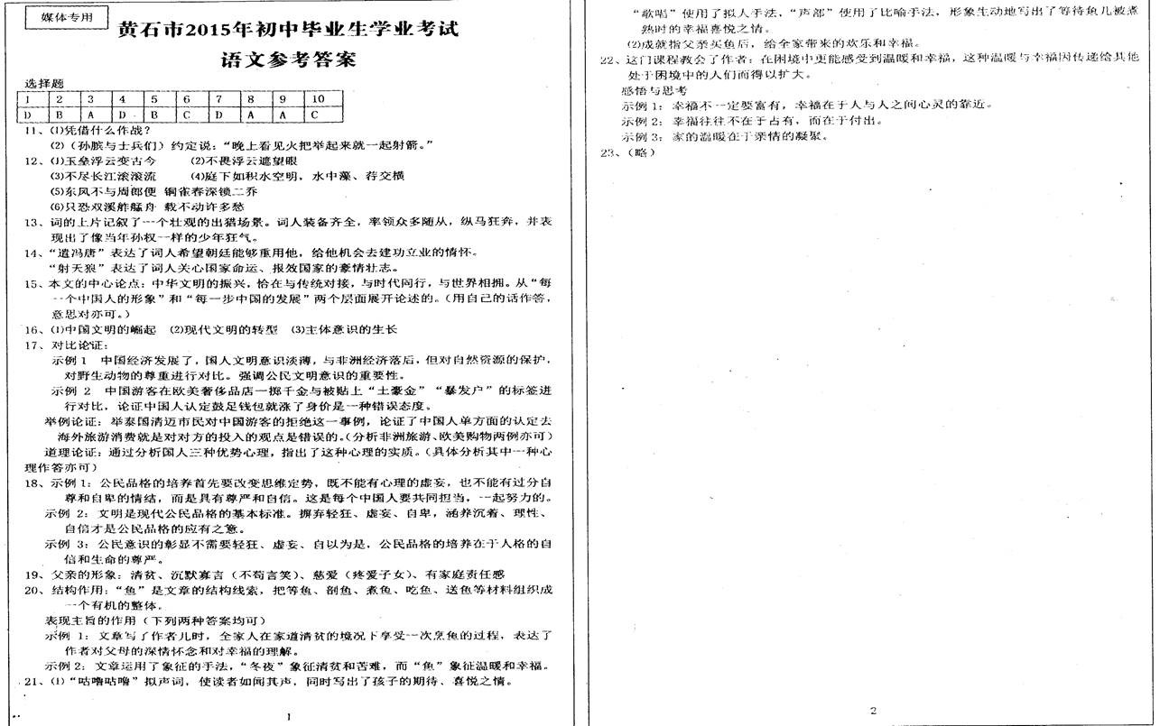 2015黄石中考语文真题及答案发布