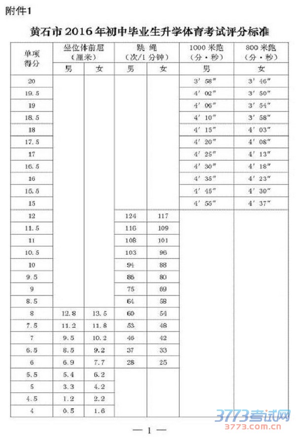 评分标准与计分办法1.评分标准:参照《国家学生体质健康标准评分表》初三年级的标准,结合黄石实际,制定《黄石市2016年初中毕业生升学体育考试评分标准》。2.计分办法:三项考试成绩以40分制按50%的比例计入中考总分,其中坐位体前屈8分;跳绳12分;1000米跑(男)、800米跑(女)20分。