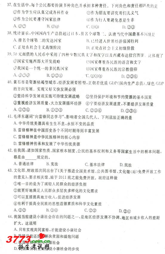 湖北黄石2011中考文综试题