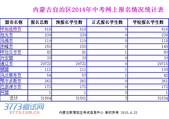 2014内蒙古中考网上报名情况统计表