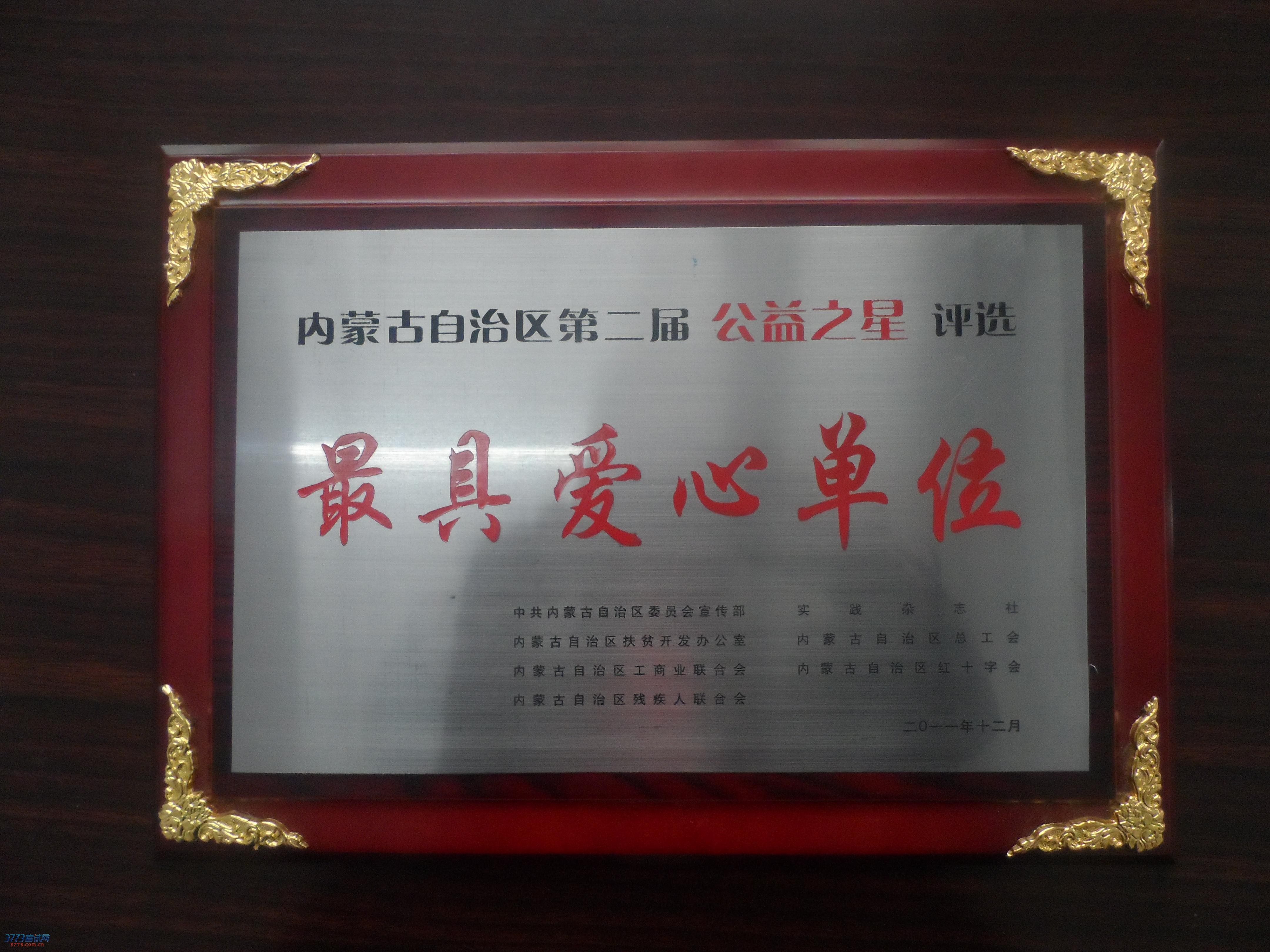 2011年11月,被内蒙古自治区党委宣传部、内蒙古自治区扶贫办、内蒙古自治区总工会、内蒙古自治区工商联、内蒙古自治区红十字会、内蒙古自治区残疾人联合会、《实践杂志》授予“内蒙古自治区第二届公益之星---最具爱心单位”。