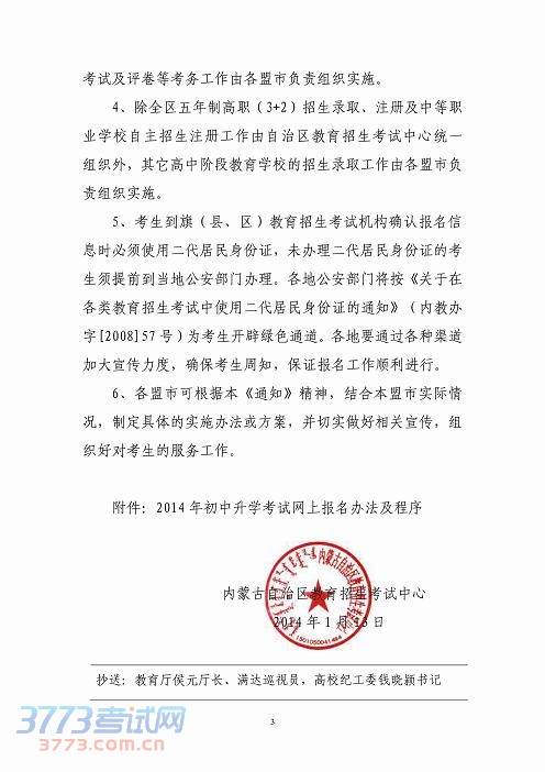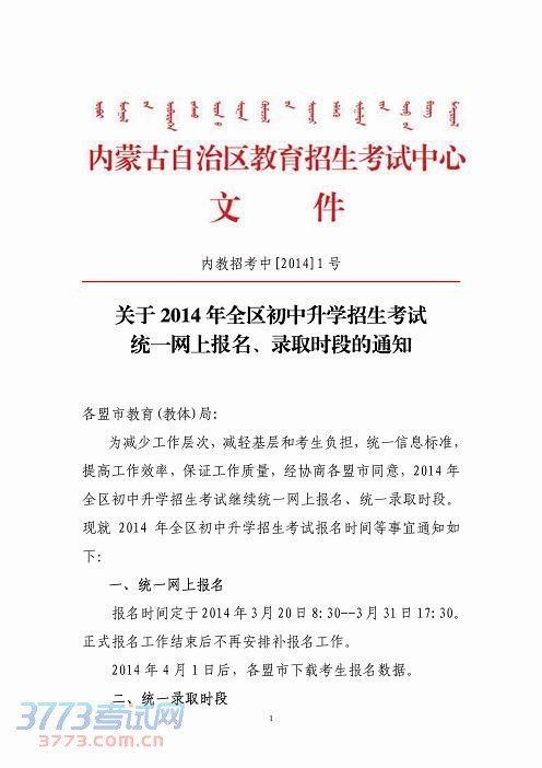 关于2014年全区初中升学招生考试统一网上报名、录取时段的通知