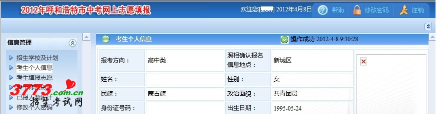 2、点击“考生个人信息”功能钮,即可显示如下界面: