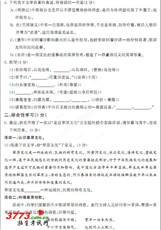 2012年内蒙古呼和浩特市中考语文试题及答案