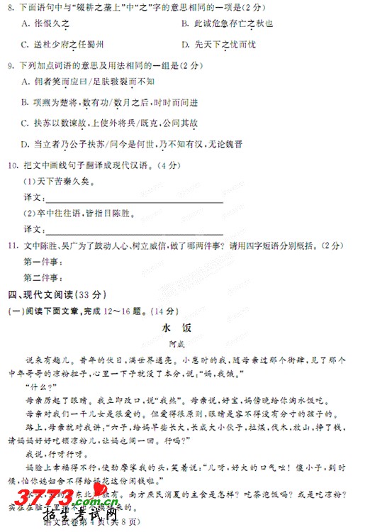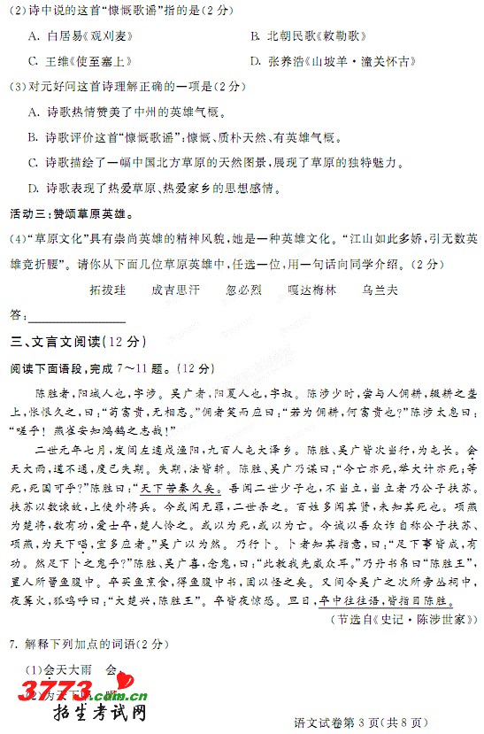 2012年内蒙古呼和浩特市中考语文试题及答案