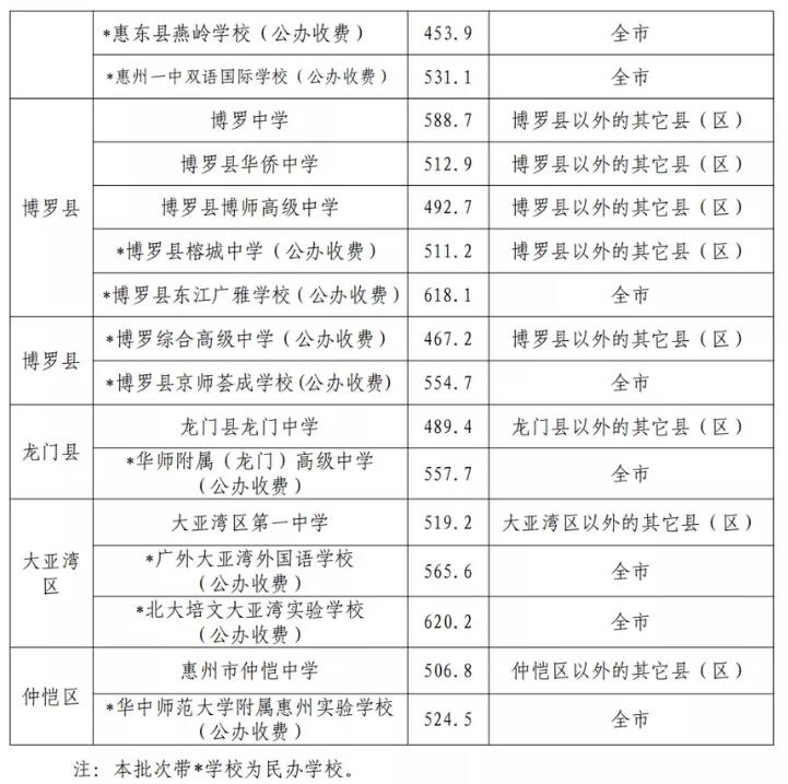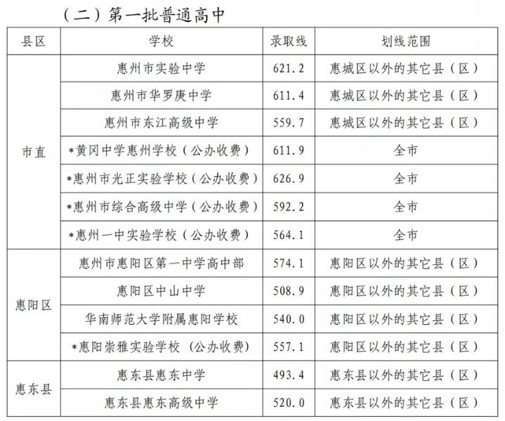2021年广东惠州市普通高中学校录取分数线:第一批