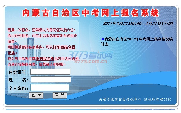 2017呼伦贝尔中考网上报名系统入口-内蒙古招生考试信息网,考生本人登录“内蒙古招生考试信息网”(http://www.nm.zsks.cn)初中升学考试网上报名系统。