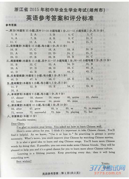 2015湖州中考英语试题及答案