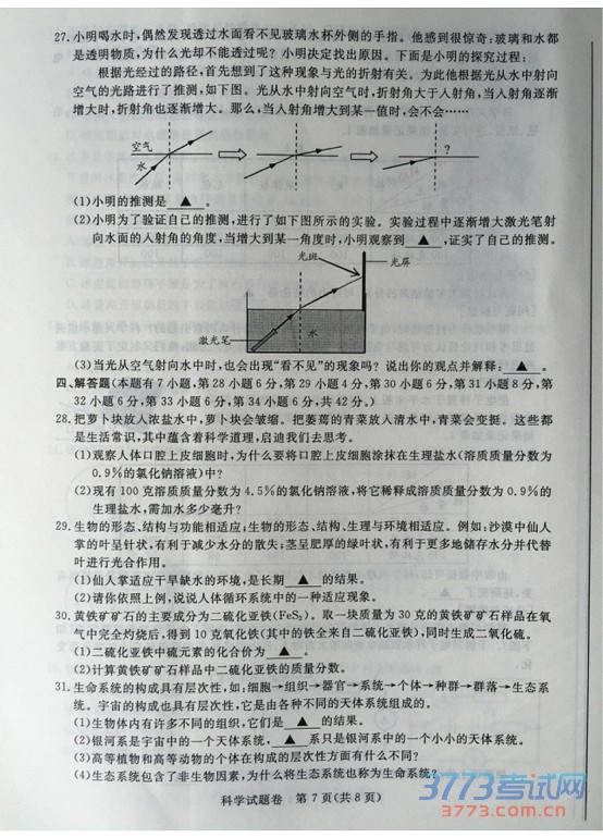 2015湖州中考科学试题及答案发布