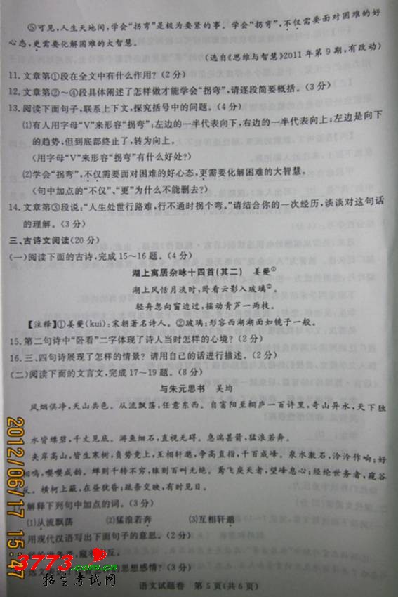 2012湖州中考语文试题及答案