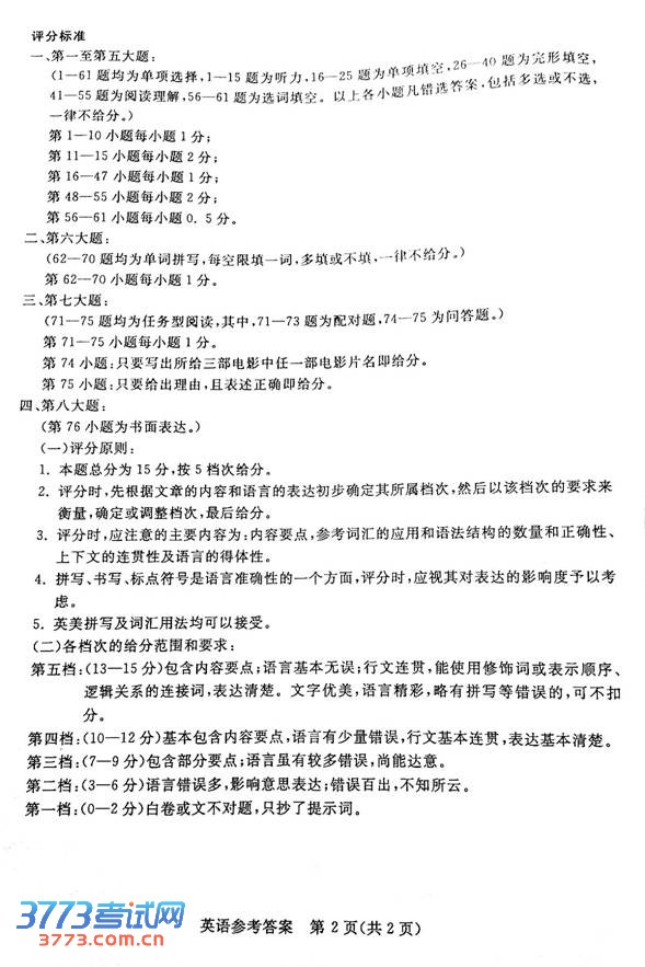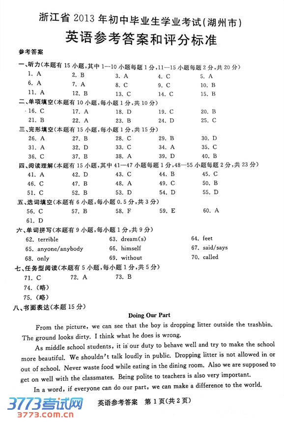 2013湖州中考英语答案评分标准(含试题)