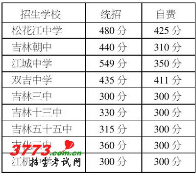 7月11日下午,我市2012年普通高中招生录取分数线正式公布。吉林一中:统招生589分,自费生582分;毓文中学:统招生572分,自费生541分;吉化一中:统招生572分,自费生541分;吉林十二中:统招生550分,自费生497分……