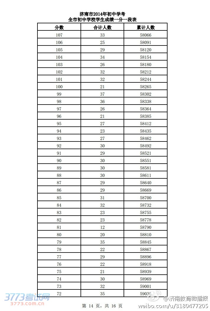 2014济南中考学考成绩一分一段表
