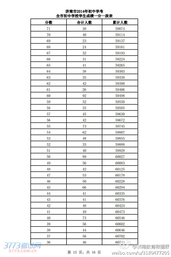 2014济南中考成绩一分一段表全市39028人